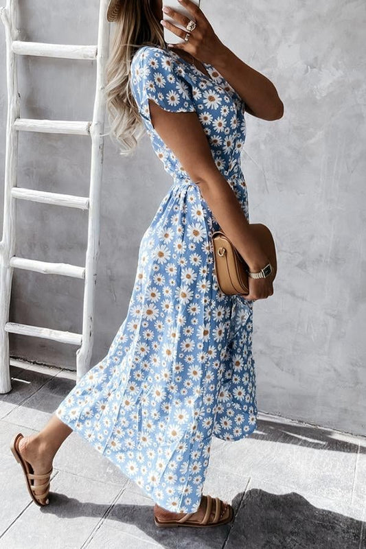 👗Casual Print V-Neck Waist Wrap Long Dress