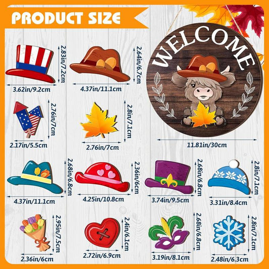 🐇 Easter Sale💥Highland Cow Sign Interchangeable Welcome Sign with Magnet Detachable Hats Cute Cattle Hanging